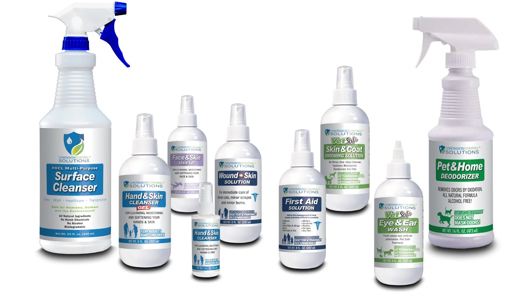 All of Contagion Control Solutions products contain hypochlorous acid and are formulated with varying concentrations to create a full line of products effective in several areas covering wound and skin management, from household cleaning or disinfecting to vet care and first aid. Contagion Control Solutions Disinfectant, registered by the EPA, and Contagion Control Solutions Wound and Skin, cleared by the FDA as a 510k medical device are the two flagship products of the Contagion Control Solutions line, and as leaders of the Contagion Control Solutions family, can give you the assurance of our product’s validity .CCS Solution is FDA,EPA,USDA,ISO,OMRI certified and CDC recommended .We are one of the highest 3rd party tested lines in the industry.